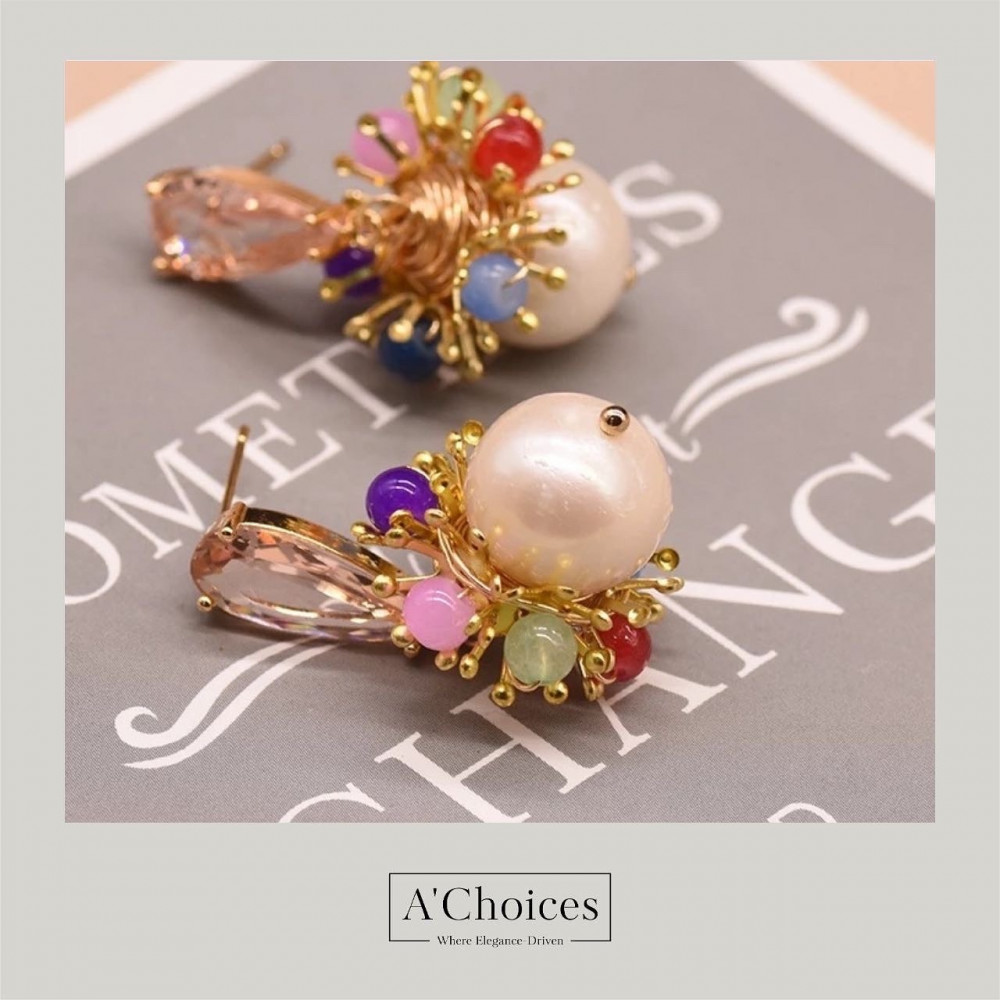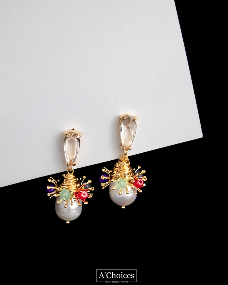 أقراط مصنوعة يدوياً من الفضة والنحاس المطلي بالذهب مع اللؤلؤ الزراعي والأحجار الملونة