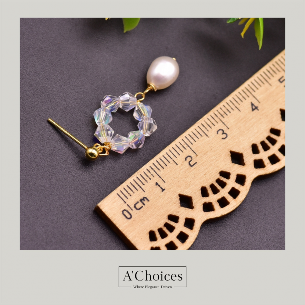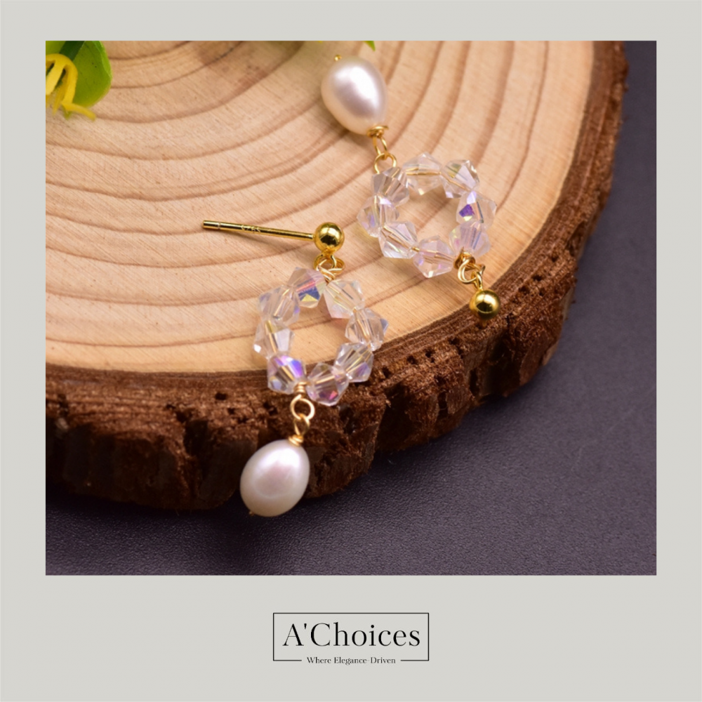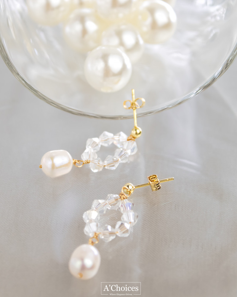 أقراط مصنوعة يدوياً من الفضة والنحاس المطلي بالذهب عيار 18 مع الكريستال واللؤلؤ الزراعي