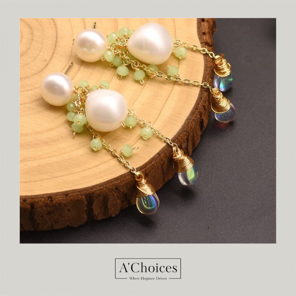 أقراط مصنوعة يدوياً من الفضة والنحاس المطلي بالذهب عيار 18 مع اللؤلؤ الزراعي والأحجار الملونة