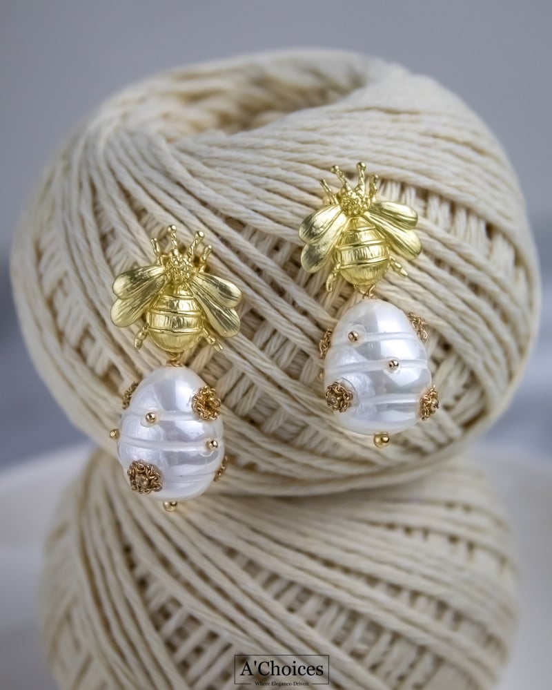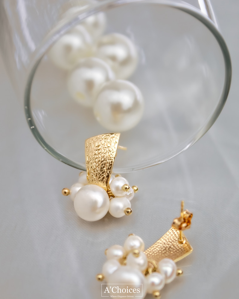 أقراط مصنوعة يدوياً من الفضة والنحاس المطلي بالذهب عيار18 مع اللؤلؤ الزراعي