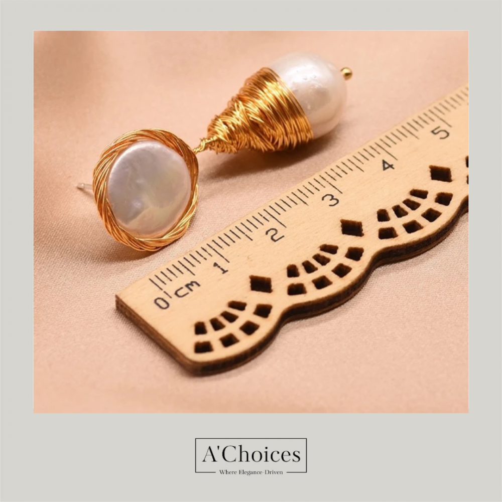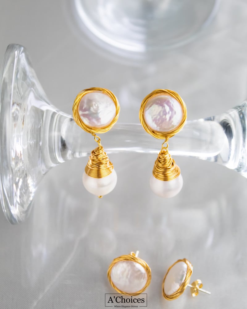 أقراط مصنوعة يدوياً من الفضة والنحاس المطلي بالذهب عيار18 مع اللؤلؤ الزراعي