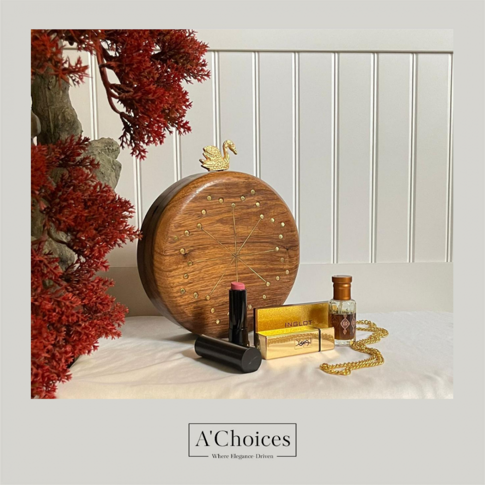 • تعتبر حقيبة يد نسائية هذه الحقيبة اليدوية المصنوعة من الخشب من الحقائب النسائية الأنيقة والفريدة من نوعها، حيث تتميز بتصميم هندي فريد وجذاب يجمع بين الطابع العريق والعصري