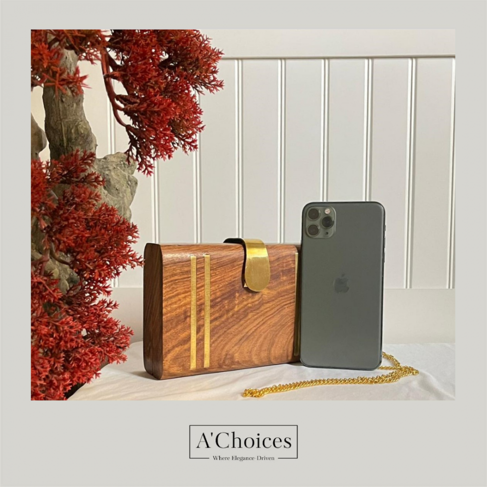 حقيبة يد هندية أنيقة مصنوعة يدوياً من الخشب مع سلسلة ذهبية