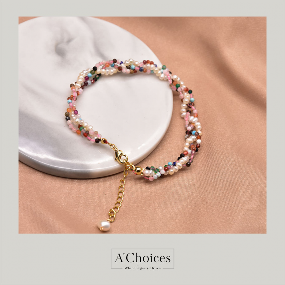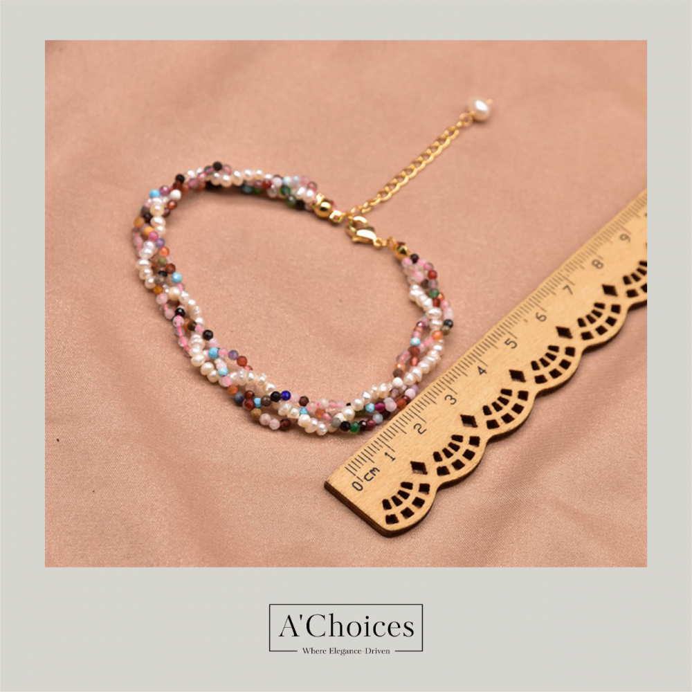سوار مصنوع يدوياً من النحاس المطلي بالذهب عيار 18 مع اللؤلؤ الزراعي والأحجار الملونة