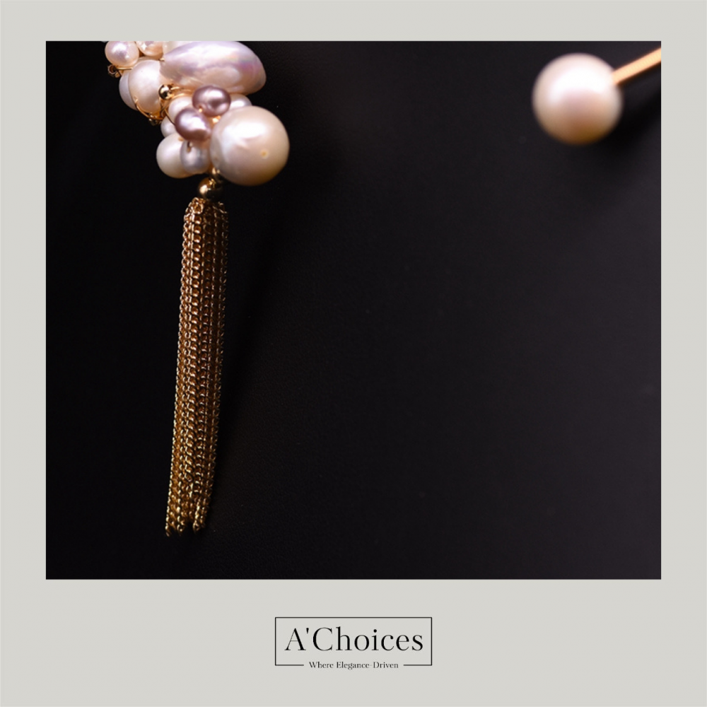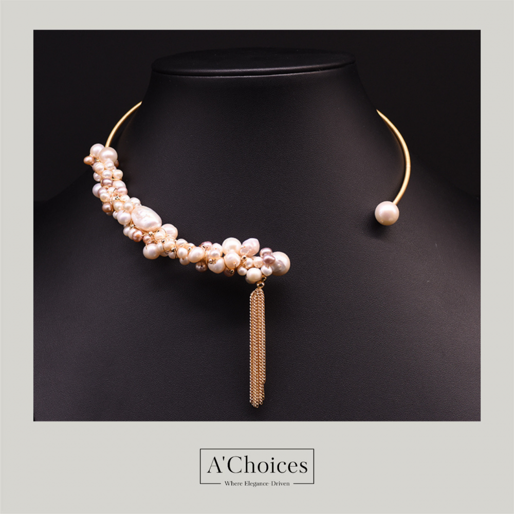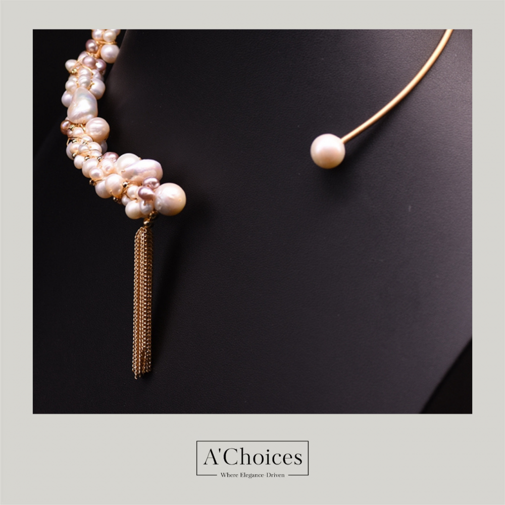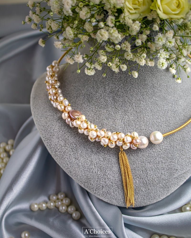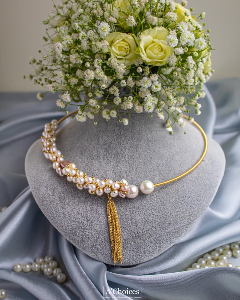 عقد تشوكر مصنوع يدوياً من النحاس المطلي بالذهب عيار 18 مع اللؤلؤ الزراعي